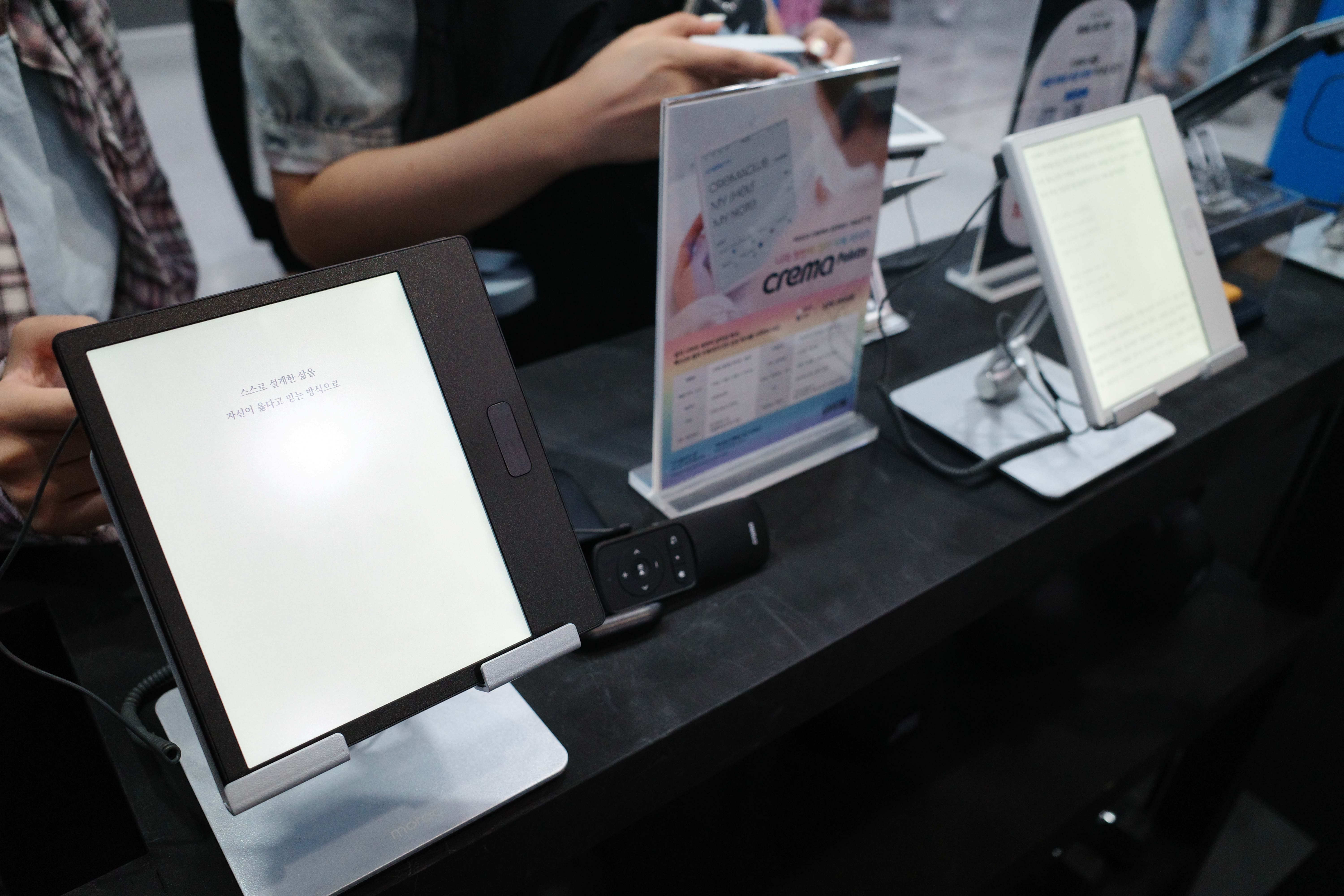 예스24 예스24는 북 피트니스라는 전체 컨셉을 잡고 독서 체력왕의 루틴이나 꿀팁을 적도록 유도했어요. 부스 내부에서는 이북 리더기인 '크레마 시리즈'를 다양하게 체험해 볼 수 있는 존을 만들었고요, 한쪽에서는 운동왕 이벤트를 열어 책 모양의 아령을 드는 이벤트를 함께 진행해 방문객의 체류 시간을 늘렸습니다.