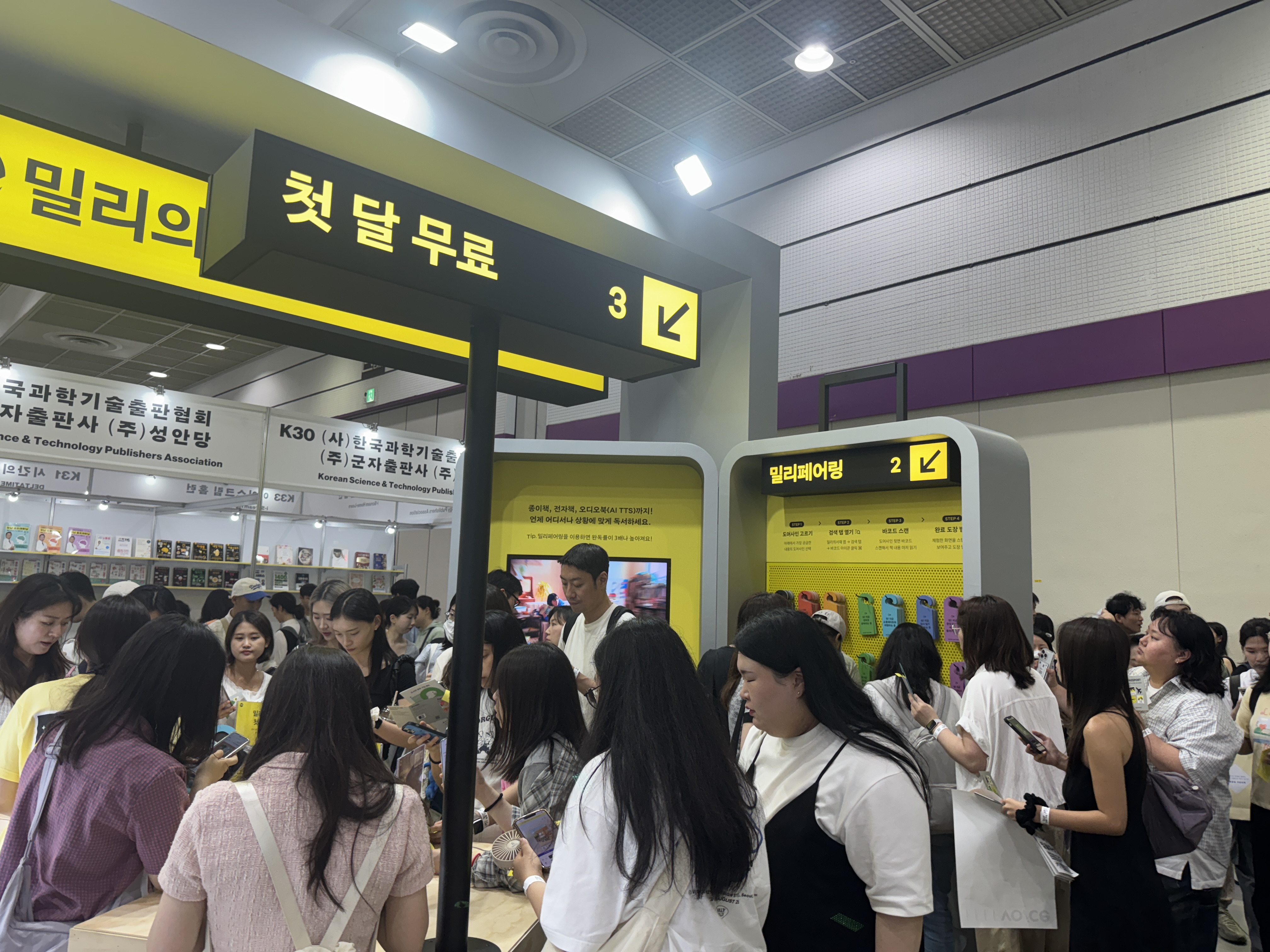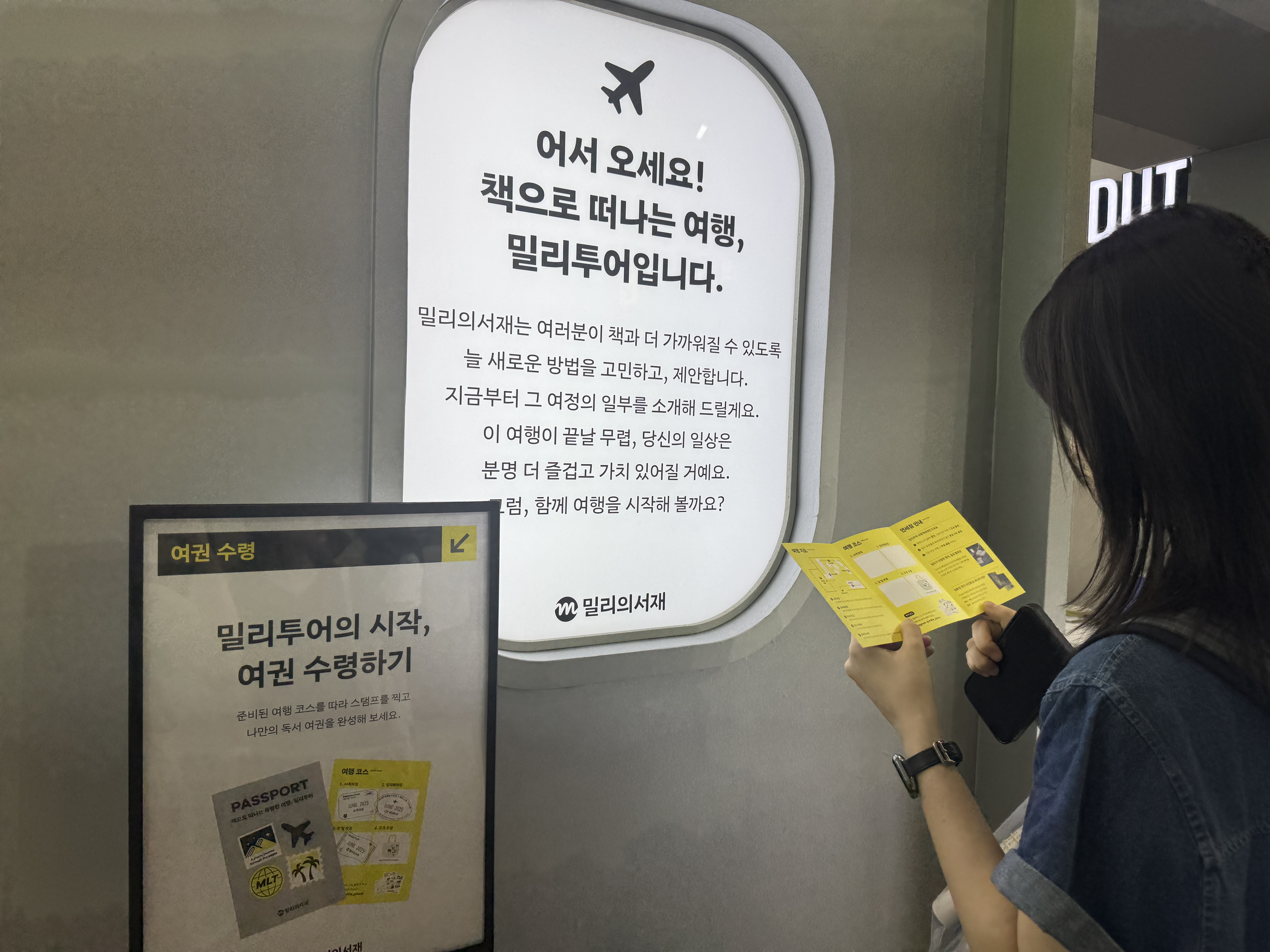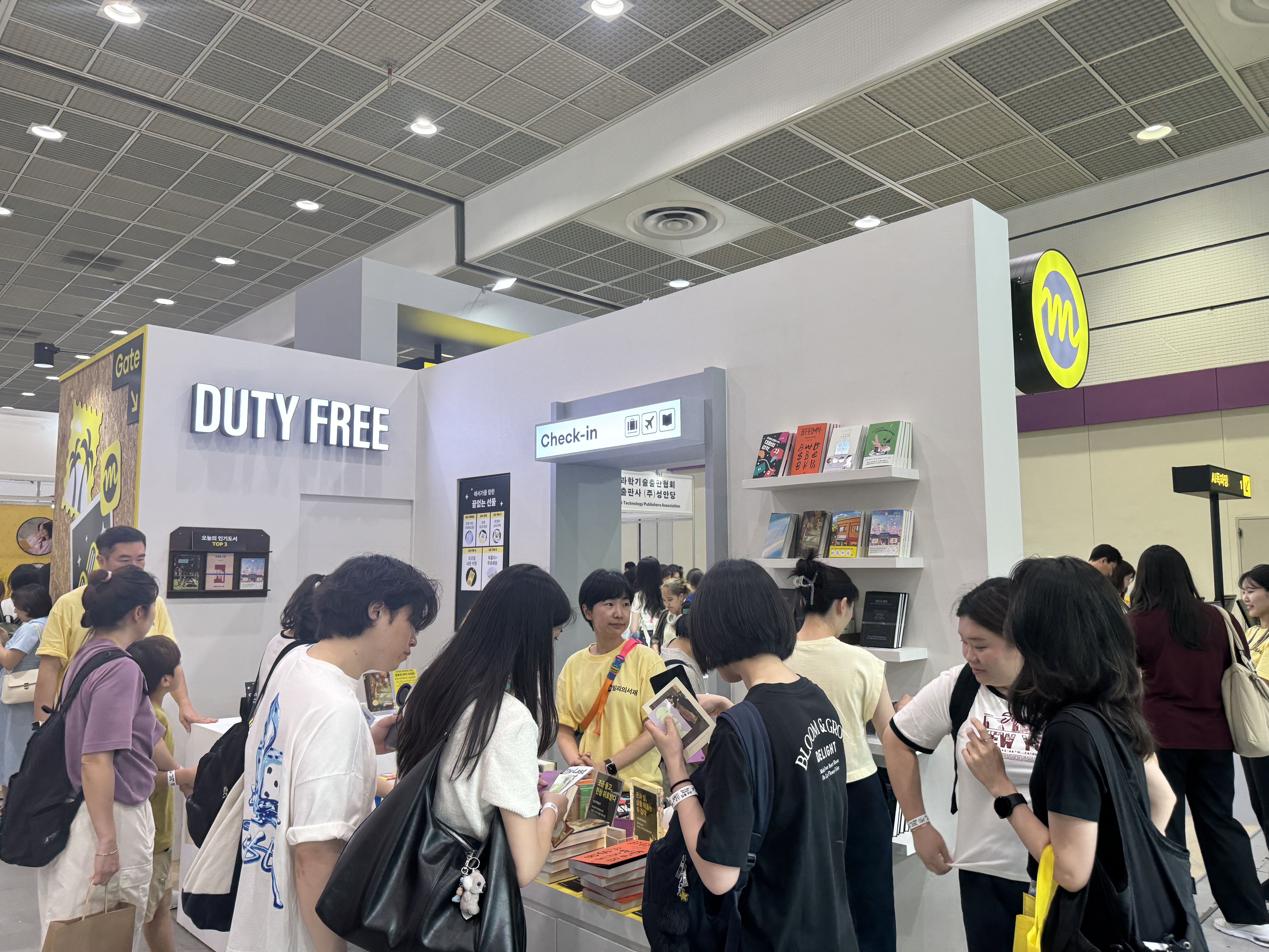 밀리의 서재 부스 전체를 공항처럼 꾸며, 입구는 티켓팅 카운터, 내부는 출국 심사대와 면세점, 탑승 게이트 등으로 구성해 ‘책으로 떠나는 여행’이라는 콘셉트를 구현했습니다. 관람객들은 실제로 여행을 떠나는 듯한 동선을 따라 부스를 체험하며, 다양한 이벤트와 굿즈를 만날 수 있었습니다.