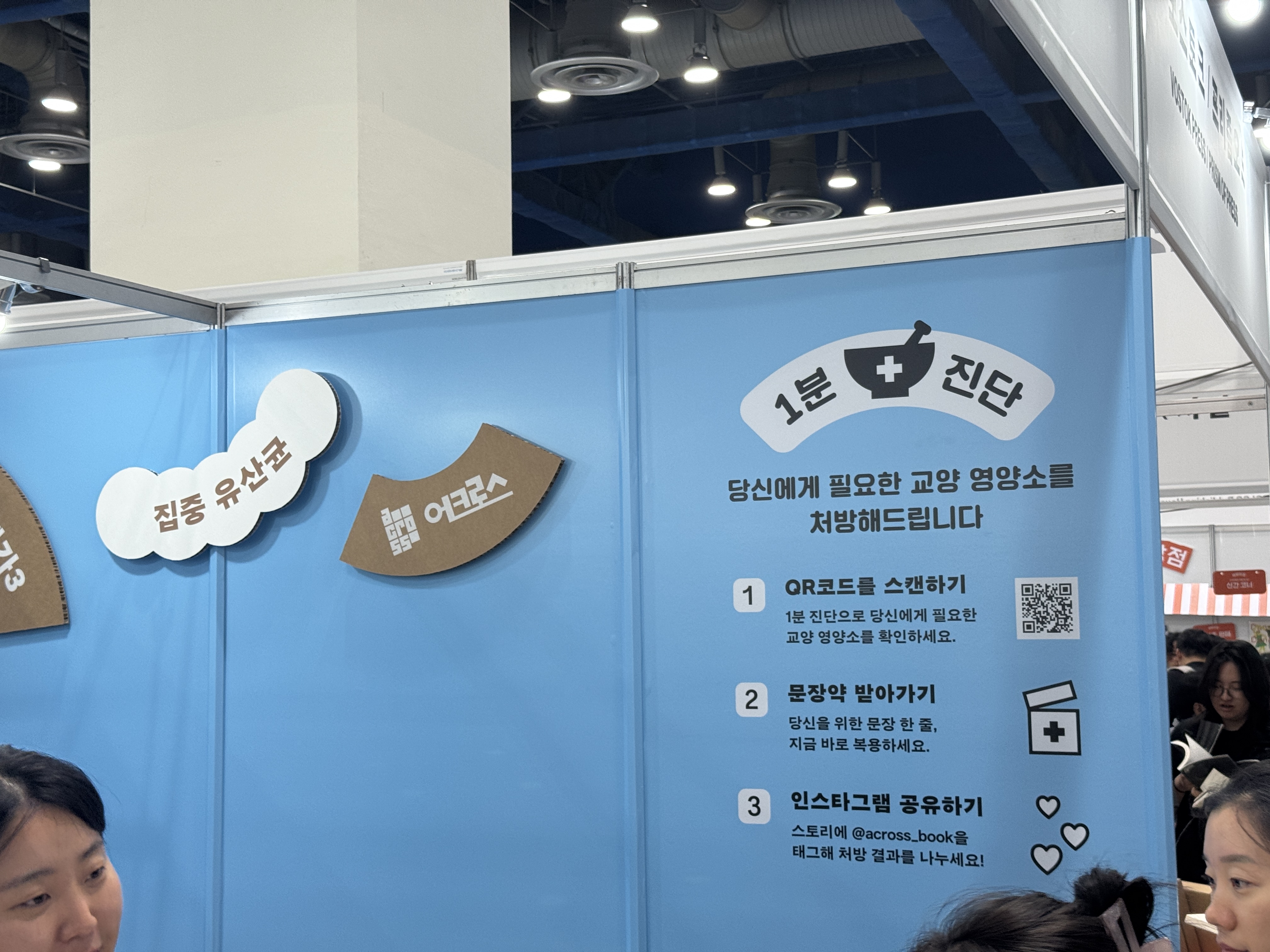 어크로스 ‘약국’을 컨셉으로 정했어요. 관람객이 간단한 테스트를 거친 뒤 ‘책 처방전’을 받아볼 수 있도록 연출했습니다. 공간 자체가 책이 마음의 약이라는 메시지가 되어, 따뜻하고 위로가 되는 경험을 제공했습니다. 집중력이 약한 저에게는 집중 유산균 책이 처방되었어요.