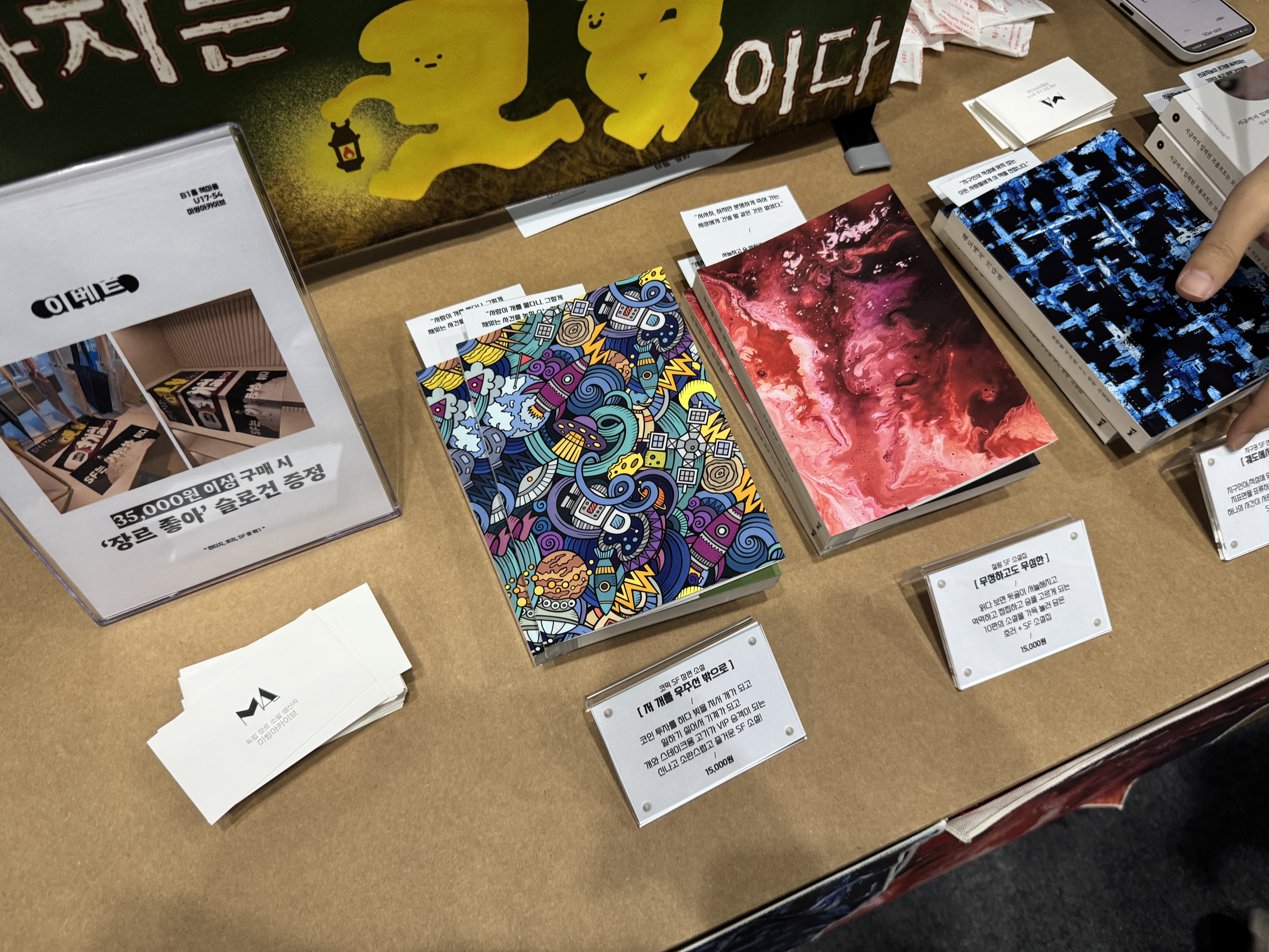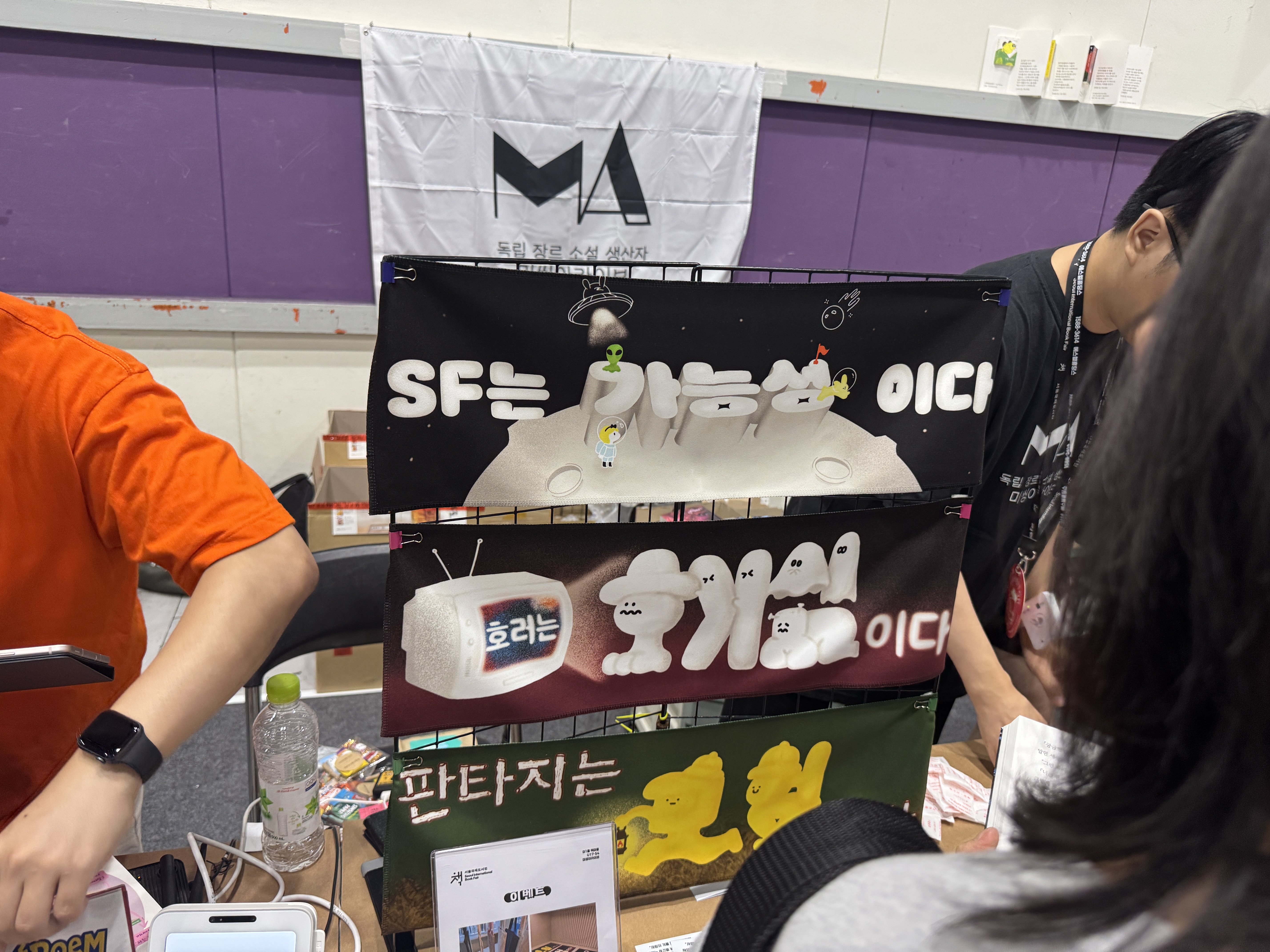 미씽아카이브는 장르물을 전문으로 하여 표지부터 출판사의 색깔이 느껴졌는데요. 구매 이벤트로 락페스티벌에서나 볼 법한 슬로건을 증정해 관람객의 마음을 사로잡았습니다.
