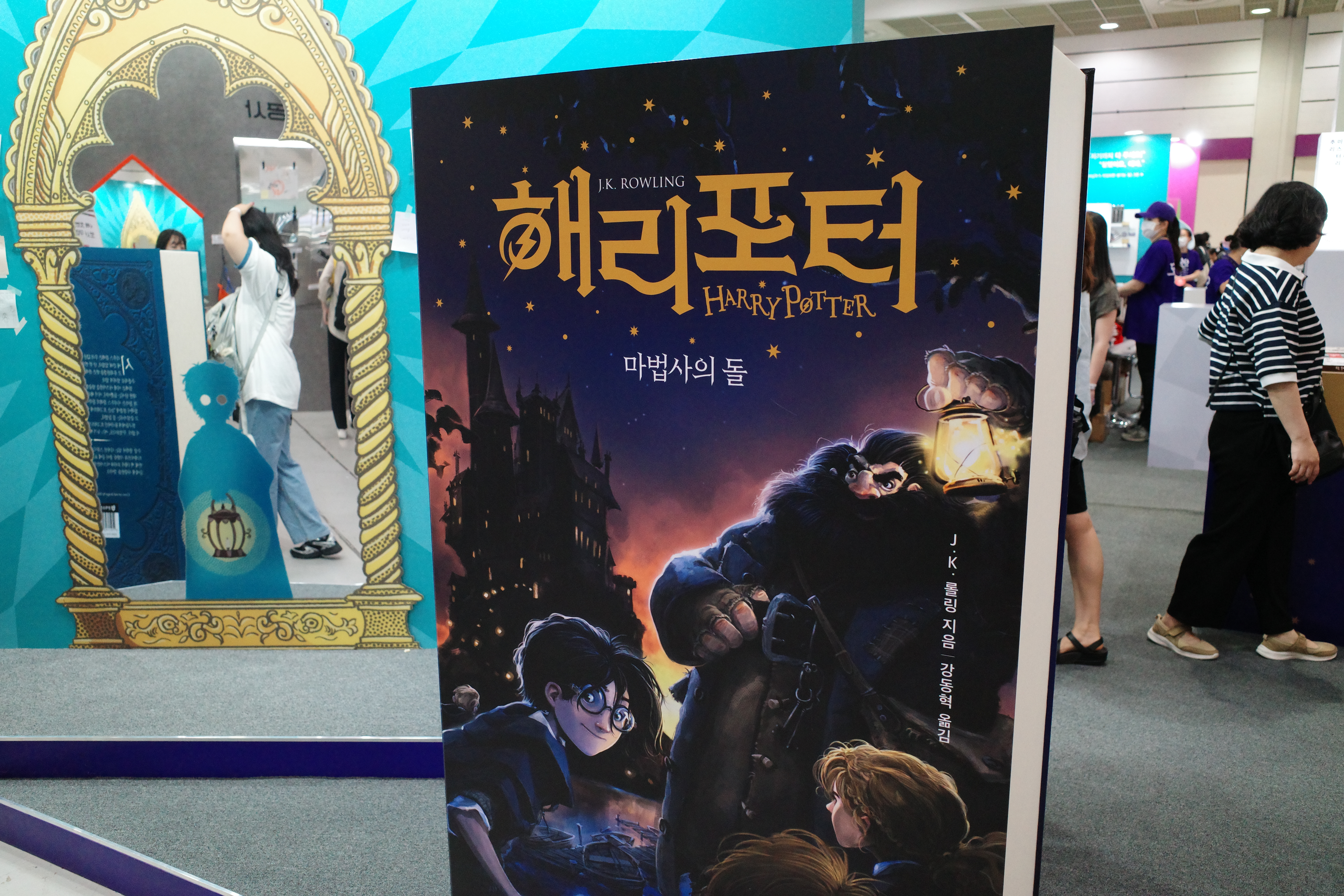 문학수첩은 강력한 IP인 해리포터 시리즈를 전면에 내세워 부스 전체를 마법 세계로 꾸몄습니다. 입구에는 해리포터 책 표지를 활용한 두 곳의 포토존이 마련되어 있었고, 책 속 명장면인 ‘소망의 거울’을 실제로 전시해 또 하나의 인기 포토존을 만들었습니다. 뿐만 아니라 소망의 거울 컨셉에 맞게 포스트잇에 소망하는 바를 적어 붙이도록 체험 요소까지 이끌어냈죠. 부스 직원들은 해리포터 세계관의 노예 캐릭터인 ‘도비’ 티셔츠를 맞춰 입어 유쾌한 센스를 더했어요. 많은 관람객이 이곳에서 한참 머물며 사진을 찍고 즐거운 분위기를 만끽했습니다.