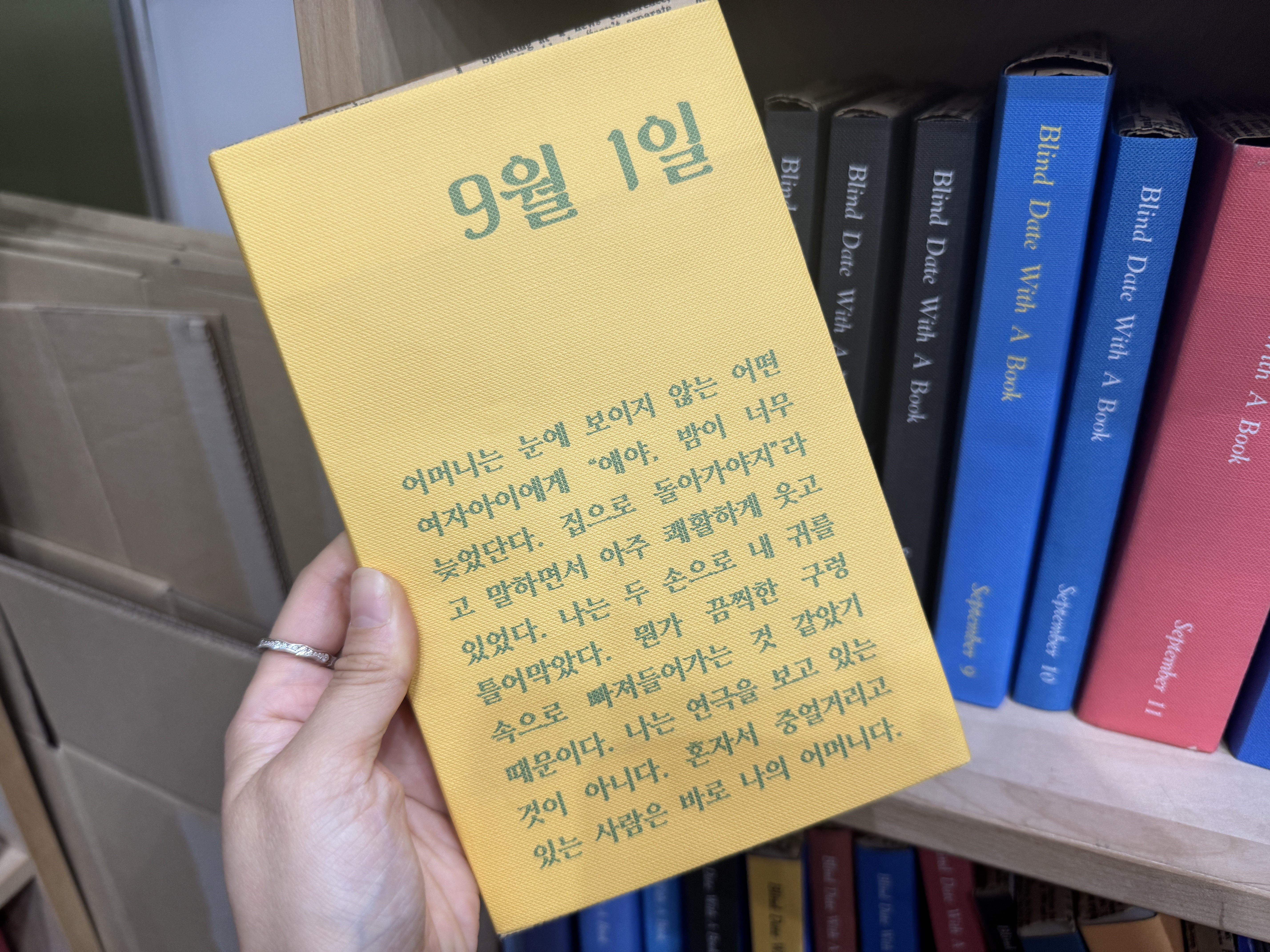 생일 블라인드북 생일책은 역시 읽을 마음은 모든 책이 블라인드북입니다. 다만 표지에 1월 1일부터 12월 31일까지 적혀있죠. 내 생일에 맞게 블라인드북을 결정할 수 있는 겁니다. 제 생일에 맞는 블라인드북을 골라보았습니다. 아마도 첫 문장이 힌트로 적혀있는 것 같네요. 내 생일 책이라니, 어떤 작가의 무슨 책인지 몰라도 '일단 무조건' 소장욕구를 자극하는데요. 일반적인 블라인드북을 한번 더 꼬아서 독특한 컨셉을 만들어냈습니다.