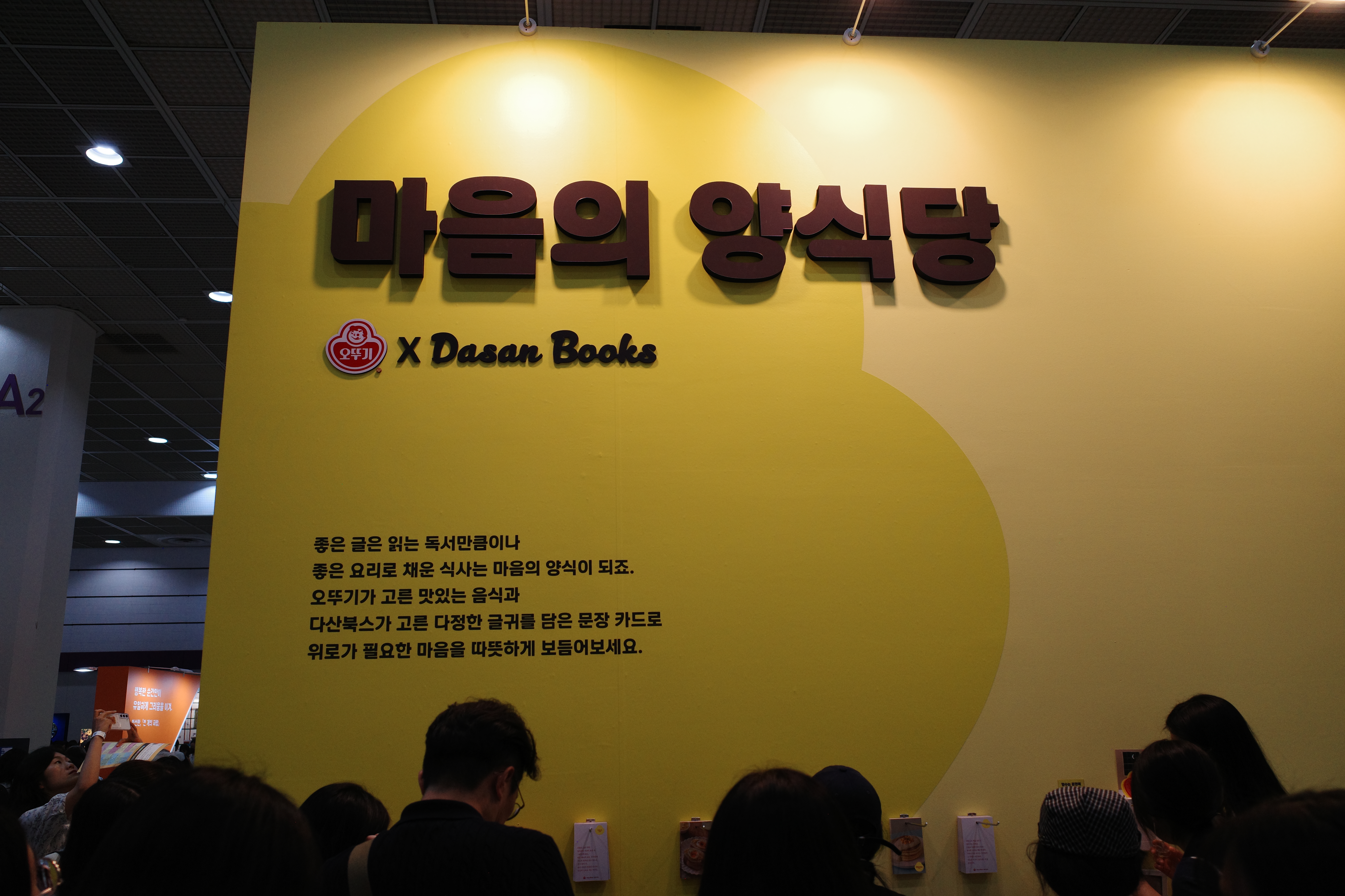 ‘마음의 양식당’ 협업 부스 다산북스와 식품기업 오뚜기는 ‘마음의 양식당’이라는 협업 부스를 선보였습니다. 관람객은 오뚜기 음식 이미지와 다산북스 도서를 매칭한 문장카드 고르기, 나만의 단어 레시피로 책갈피 키링 만들기, 오뚜기 브랜드 향 시향 등 다양한 체험에 참여할 수 있었습니다. 오뚜기 굿즈와 다산북스 도서를 구매하거나 SNS 인증을 하면 특별 사은품도 증정되었습니다.