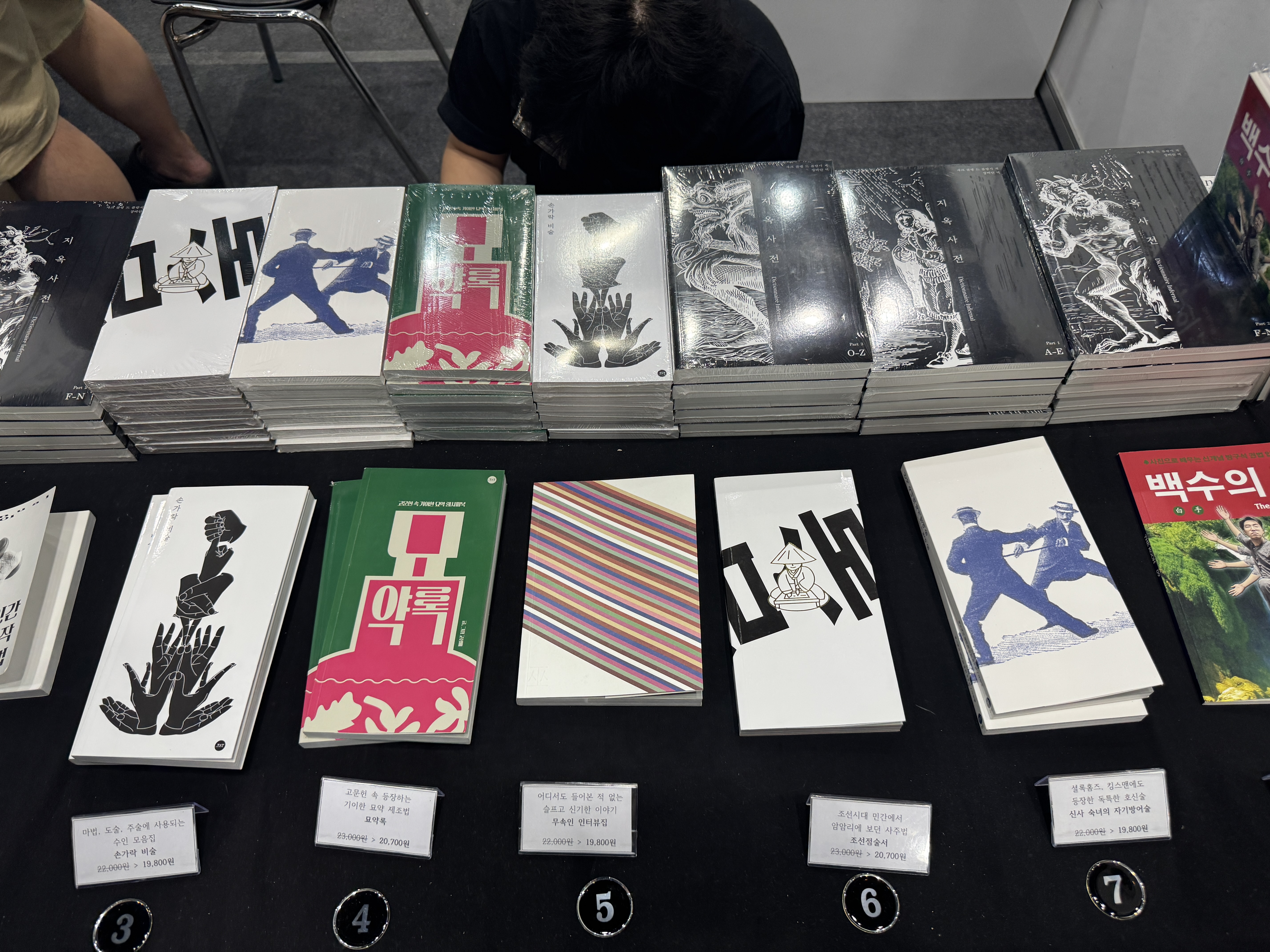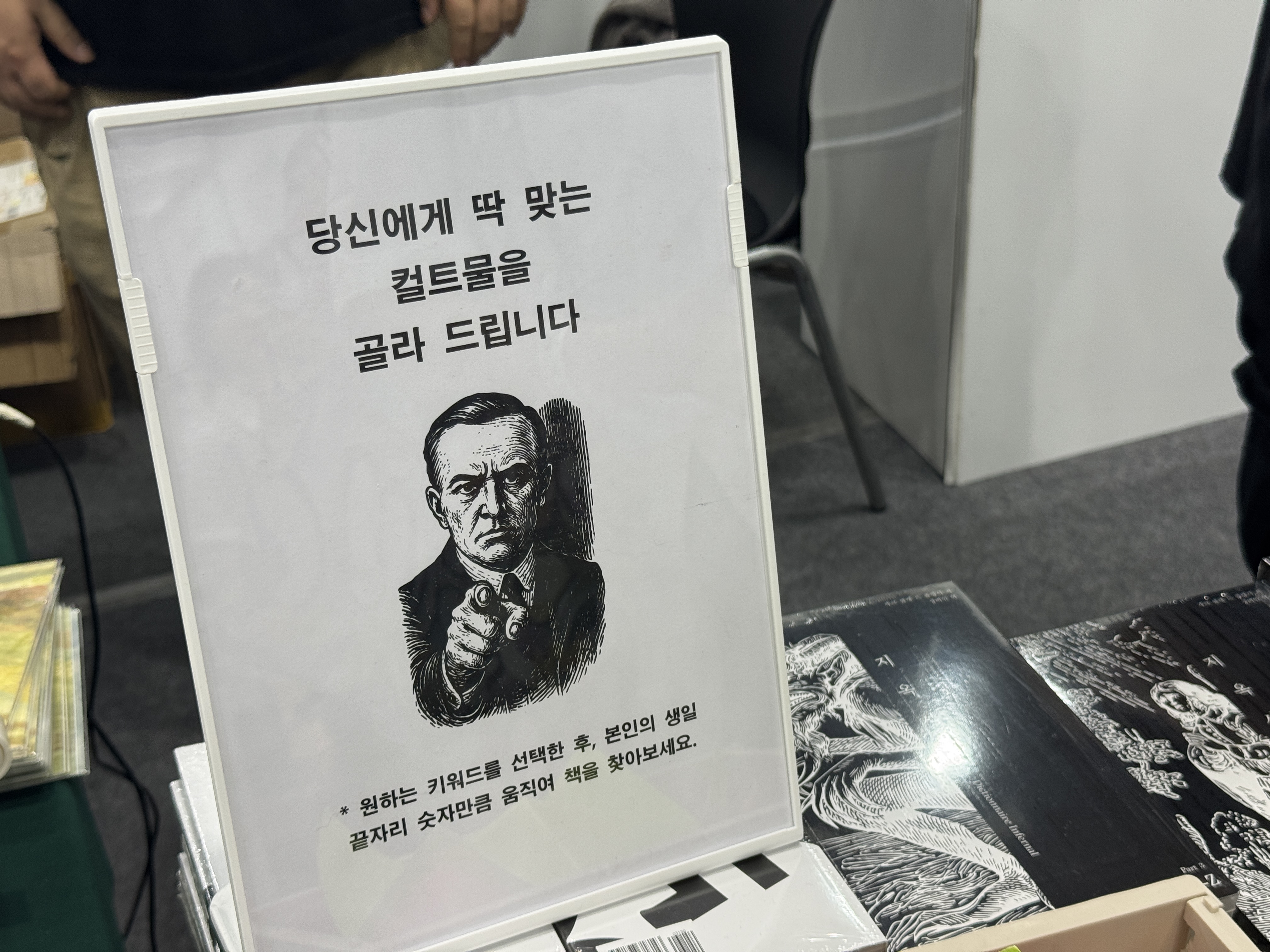 닷텍스트&에디시옹장물랭은 부스 벽 전체를 책 속지로 도배해 편집증적인 집요함이 느껴지는 공간을 연출했는데요. 관람객에게 취향에 맞는 컬트물을 골라주는 큐레이션도 진행해, 장르 팬들에게 강렬한 인상을 남겼습니다