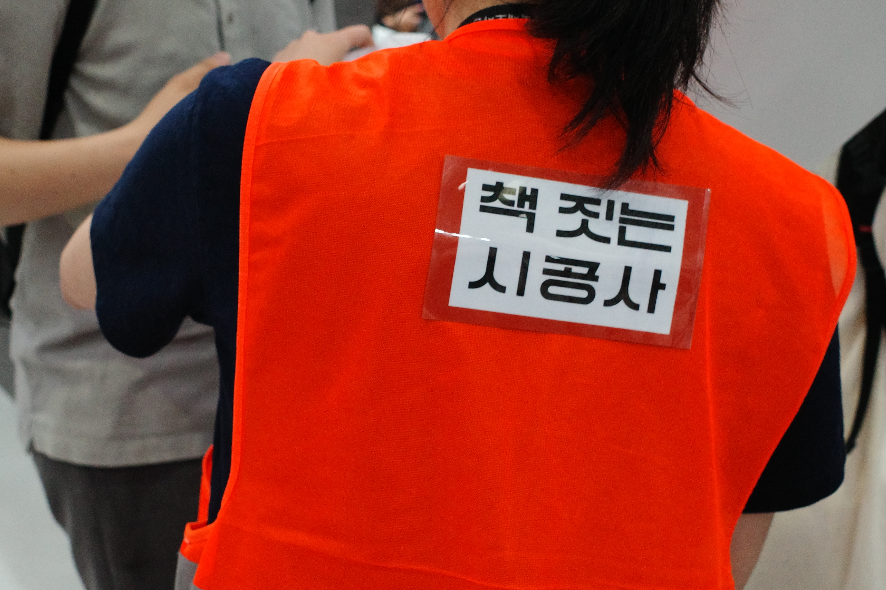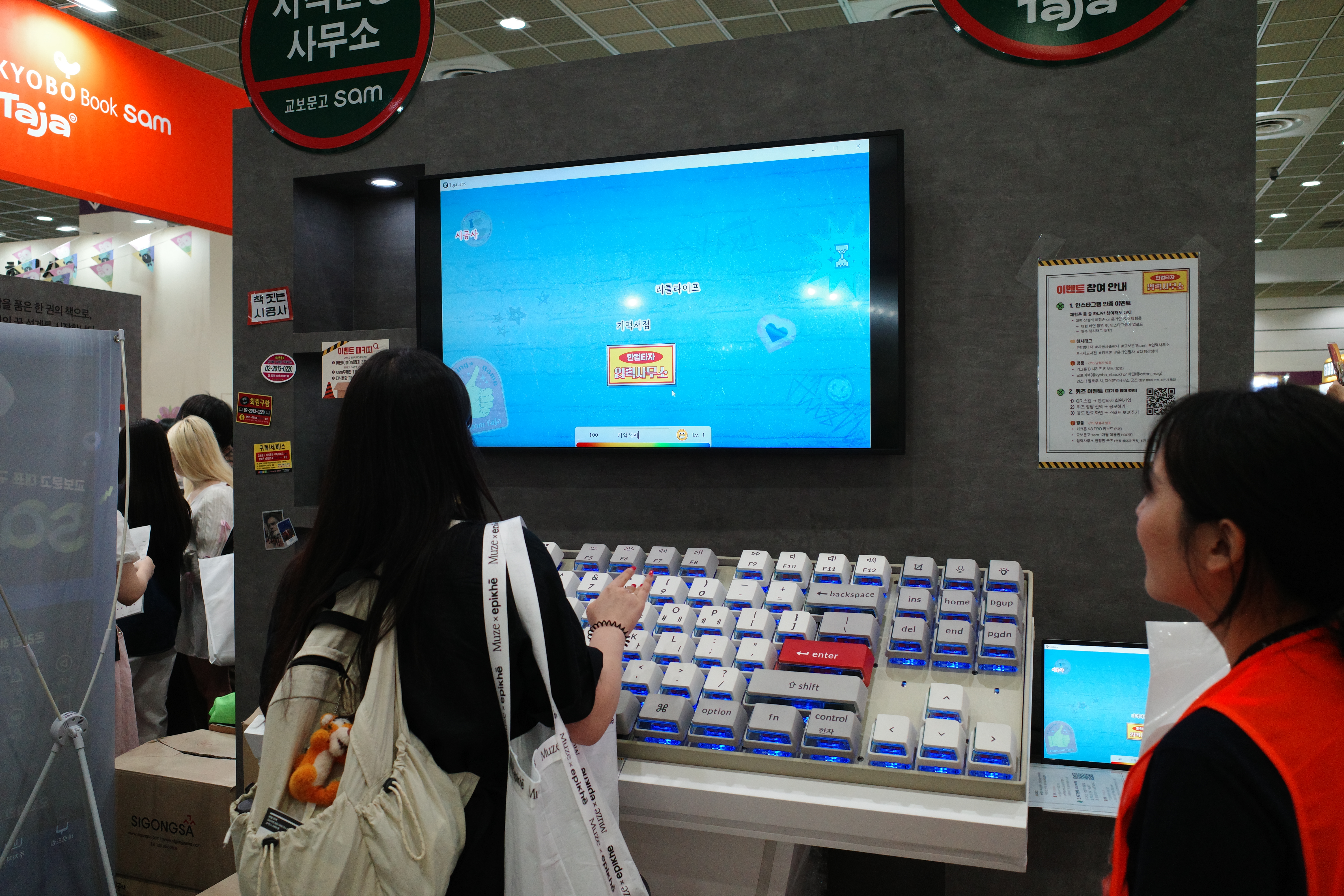 시공사 타자게임 시공사 부스에서는 대형 타자기를 활용한 ‘산성비 타자 게임’ 이벤트가 열렸습니다. 관람객이 직접 타자기로 문장을 입력하는 게임을 체험하고 인증하면 추첨을 통해 경품을 증정하는 이벤트였죠. 시공사 부스에 대한 소개는 아래에도 이어지겠지만, 공사장을 전체 컨셉으로 정하고 해당 이벤트 코너 이름을 '입력사무소'로 지어 재미를 더했답니다.