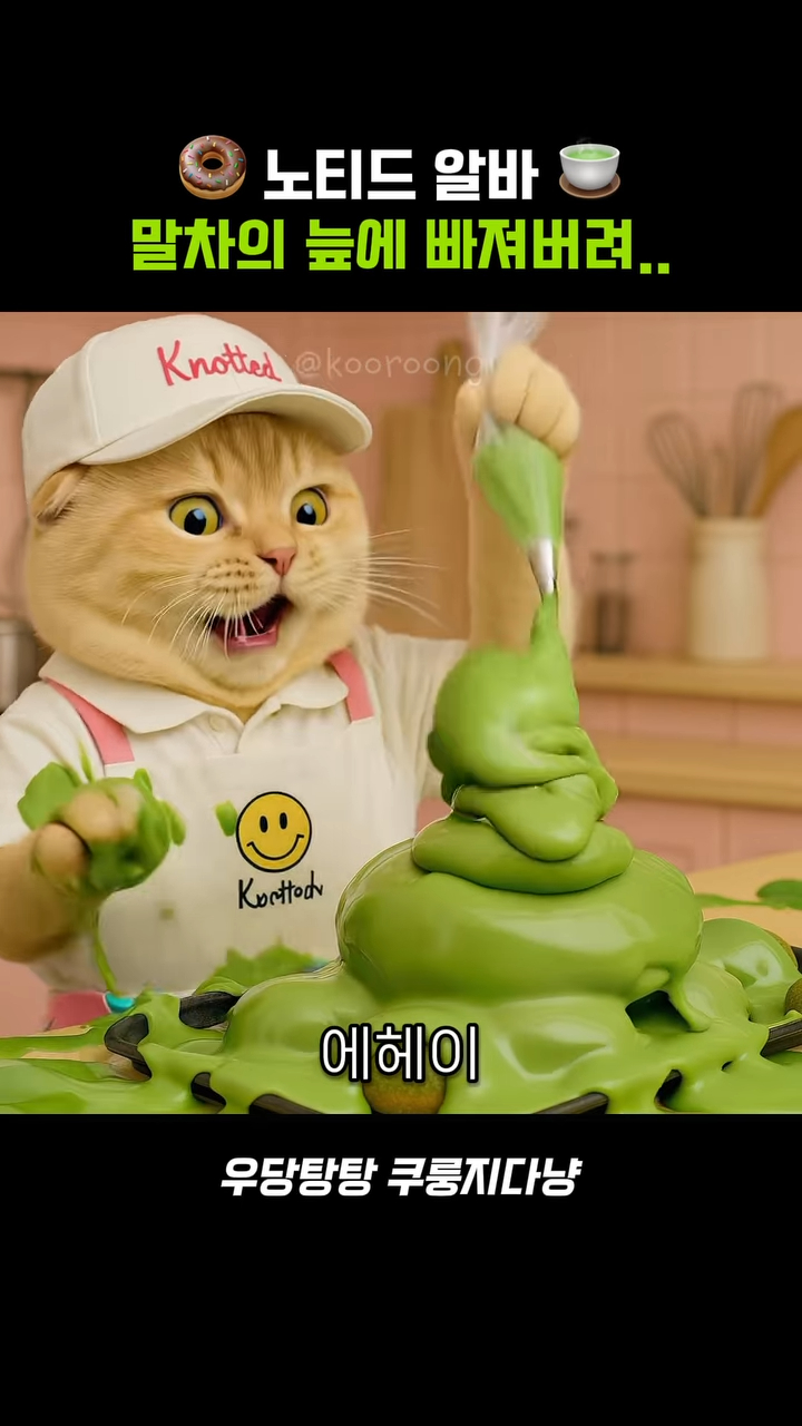 쿠룽지는 커뮤니티형 말투를 사용하며 친근함을 더했는데요. 동물들이 알바하는 건 쉽지 않나 봅니다. 쿠룽지도 역시 디저트를 만들며 우당탕탕하는데요. 그 과정에서 쿠룽지는 말차 크림을 보여주는데 좀 더 집중했습니다. 크림이 진하게 녹아내리는 모습이나, 도넛을 입에 한가득 베어 물자 입가에 크림이 묻어나는 모습을 현실감 있게 그려냈습니다.