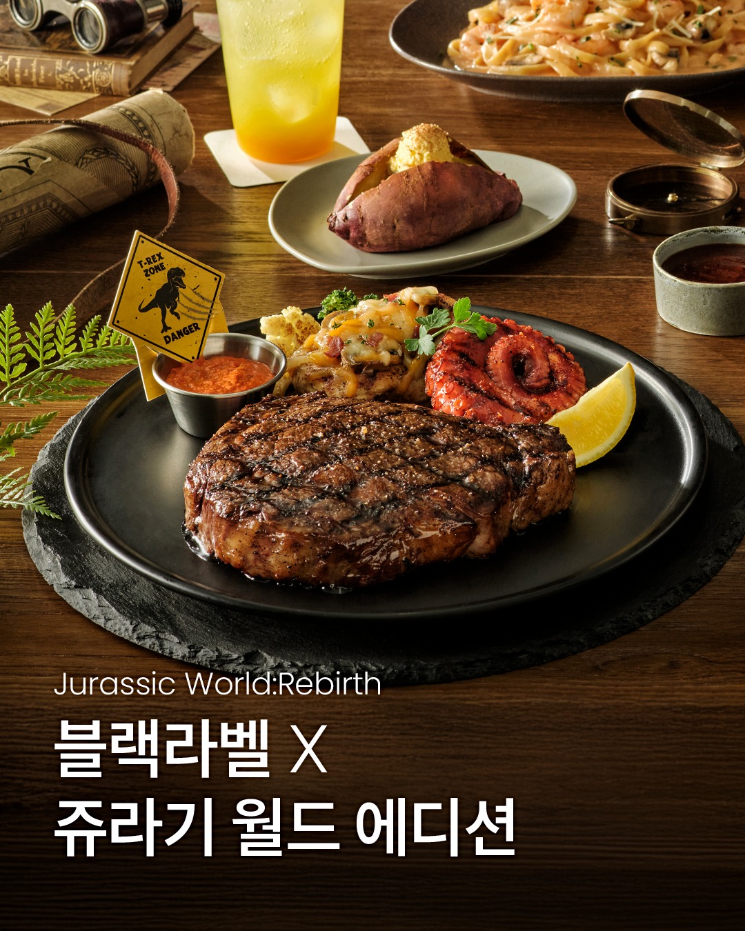 아웃백에서는 조금 더 다채로운 프로모션이 펼쳐집니다. 우선 콜라보 신메뉴, 블랙라벨 X 쥬라기 월드 에디션입니다. 이번 <쥬라기 월드> 속 등장하는 핵심 캐릭터인 육해공 공룡 컨셉을 그대로 메뉴에 담았습니다. 각각 육지, 바다, 하늘을 대표하는 요리인 스테이크와 문어 구이, 치킨을 담은 플레이트인데요. 여기에 공룡알 모양을 본뜬 초콜릿 아이스크림 디저트까지 출시해, 마치 탐험하듯 코스를 즐기면서 맛보는 즐거움을 한층 더했어요. 영화를 보고 난 후 가족과 함께 메뉴를 즐기기에도 손색없죠.