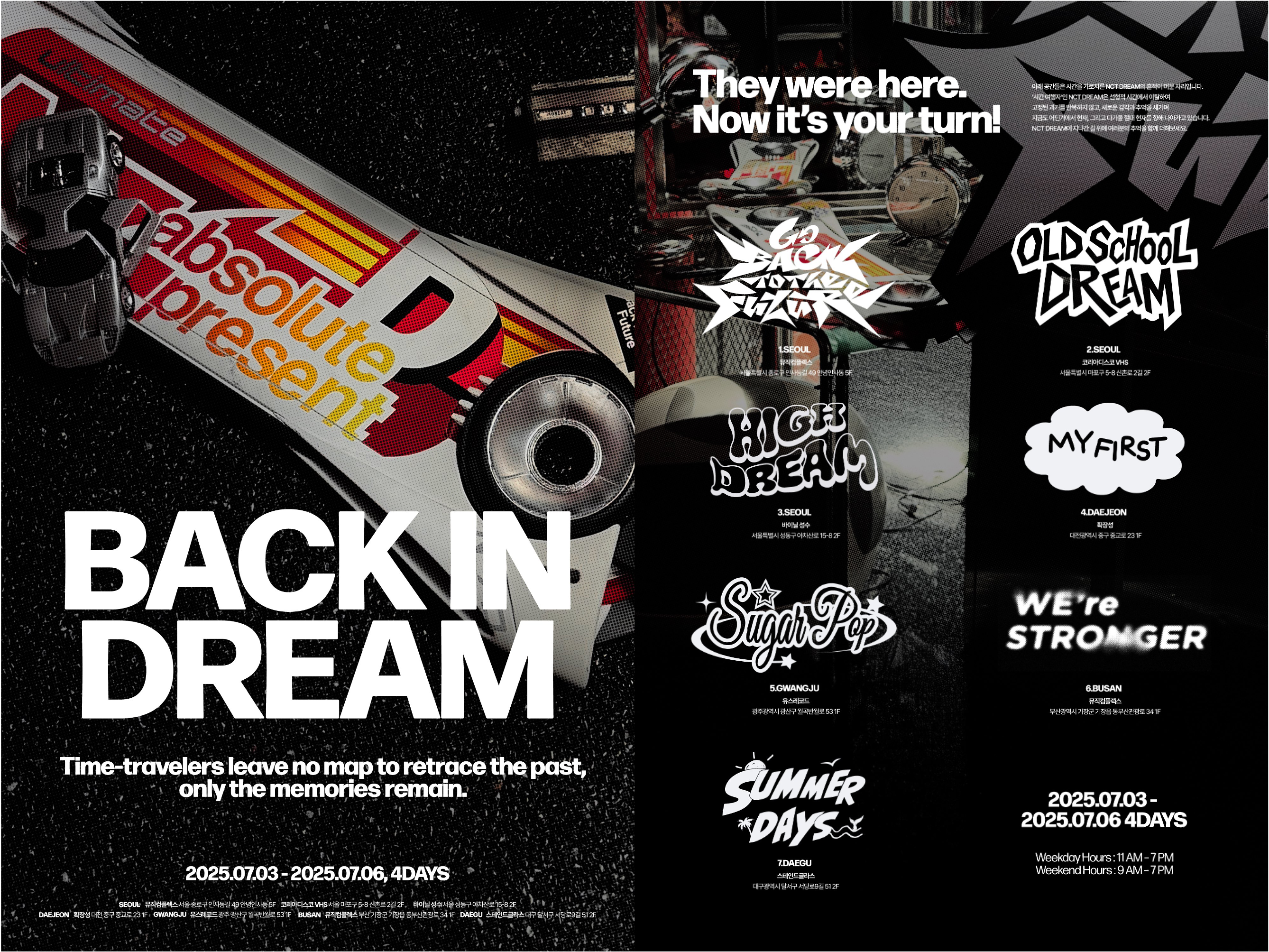 요즘 팝업스토어, 전시회 운영은 선택이 아닌 필수죠! 엔시티 드림도 이번 컴백을 기념해 전시회 ‘Back in DREAM’와 팝업스토어 'TIME RIDERS'를 진행했습니다.