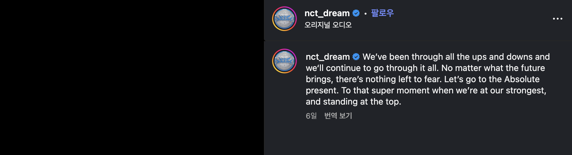 프로모션의 막바지엔 의문의 검은 배경 영상이 올라왔는데요. 영상 속 사운드를 들어보면 멤버 마크가 영어로 메시지를 전달하고 있습니다. 내용을 해석해 보면, '이제 어떤 미래도 두렵지 않으니 함께한 모든 시간을 바탕으로 가장 강한 우리가 되어 최고의 순간으로 나아가자'는 메시지를 담고 있어요.