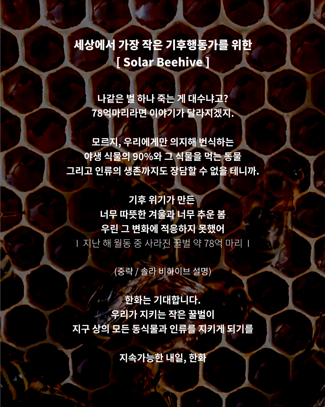 꿀벌을 가장 작은 기후행동가로 규정하고 태양광 발전으로 생산된 전력을 활용한 벌집 “솔라비하이브”를 국내 최초 개발/설치한 이 캠페인은 공익성과 꿀벌 시점에서 한화 시점으로 이동하는 흡입력 있는 카피 플로우로 세계 3대 광고제 클리오, 뉴욕페스티벌을 포함해 수많은 광고제에서 상을 휩쓸었어요.
