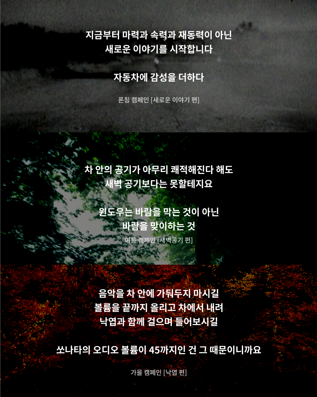 2012년 여름부터 2013년 가을까지 [자동차에 감성을 더하다]는 슬로건 하에 전개된 이 캠페인에는 그럴 듯한 영어 나레이션도, 멋진 주행 장면도, 세련된 자동차 뷰티컷도 나오지 않아요. 자동차보단, 운전자라면 한 번쯤 경험했을 멋진 순간들이 나오고 쏘나타가 더해진다면 얼마나 더 아름다워질지 암시하는 카피가 나와요. 단순히 비슷한 경험을 가진 사람들의 공감을 끌어내는 게 아니라, 경험 못한 상황조차 공감하고 싶게 만드는 멋진 카피들-