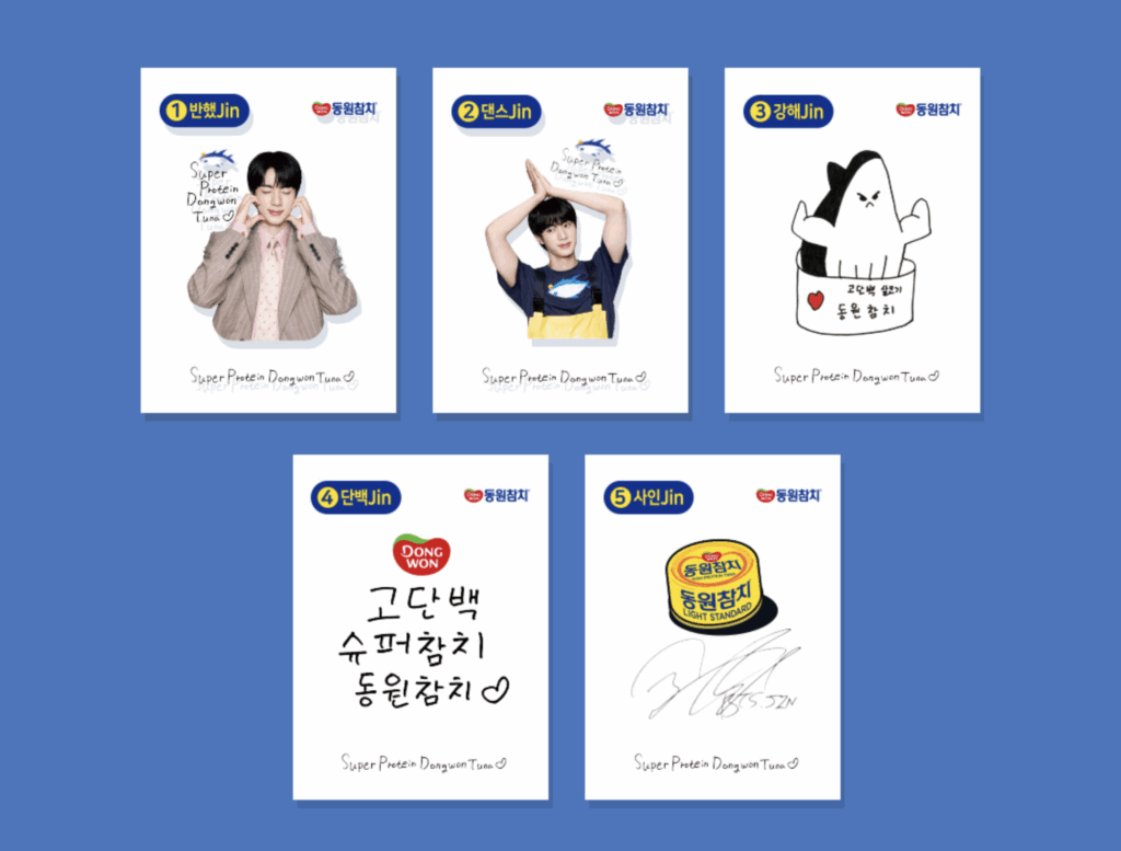 요새는 소비자들에게 물건을 파는 게 아니라 브랜드를 '경험'하게 해야한다는 말, 많이 들어보셨죠? 이번 '슈퍼 참치' 캠페인 역시 트렌디한 마케팅 전략을 모두 모았습니다. 소비자를 '미션'에 참여하게 만들었거든요. 이번 참치캔의 내용물은 기존의 고단백 살코기와 같지만, 패키지를 BTS 진의 모습이 담긴 12종의 스페셜 캔으로 바꾸고, 그 안에 5종의 띠부씰을 랜덤으로 넣었어요.