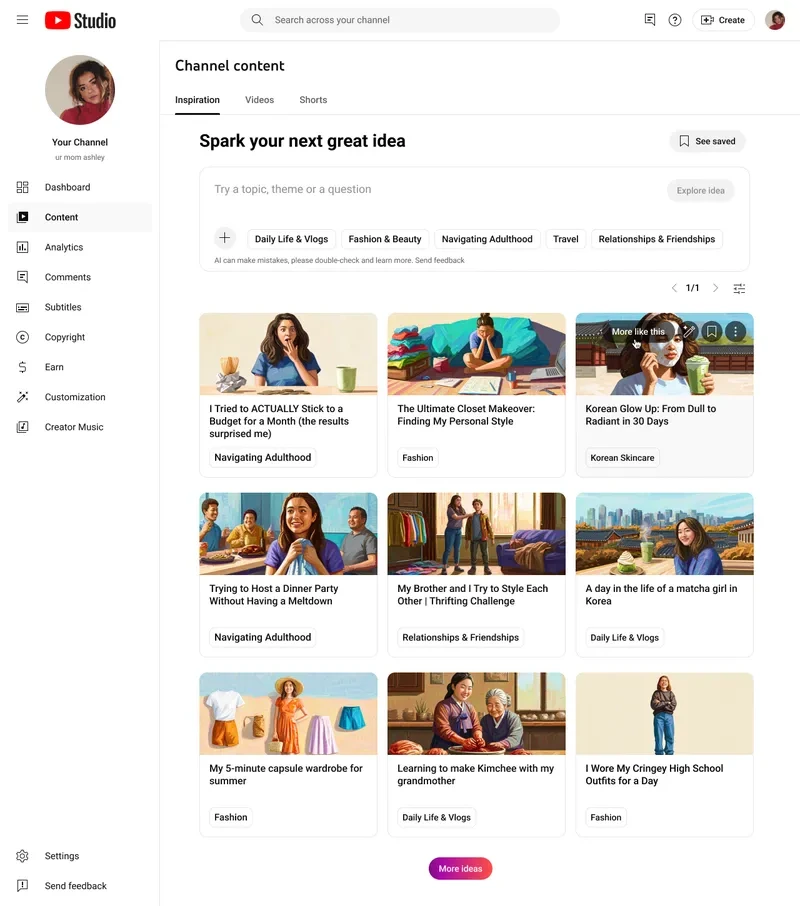 새롭게 도입된 'Ask Studio' 기능은 자연어로 질문하면 채널 데이터를 분석해 맞춤형 인사이트와 콘텐츠 아이디어를 실시간으로 제공합니다. 또, '영감 탭(Inspiration Tab)'도 전면 개편되는데요. 질문을 하면 프롬프트마다 9개의 아이디어를 제공해 콘텐츠 계획에 도움을 줍니다. 또한 단순히 아이디어만 제공하는 것이 아니라 인사이트도 제공합니다. 시청자 행동 데이터에 기반하여 제안한 아이디어가 어떻게 효과가 있을지에 대한 근거까지 제공하죠.