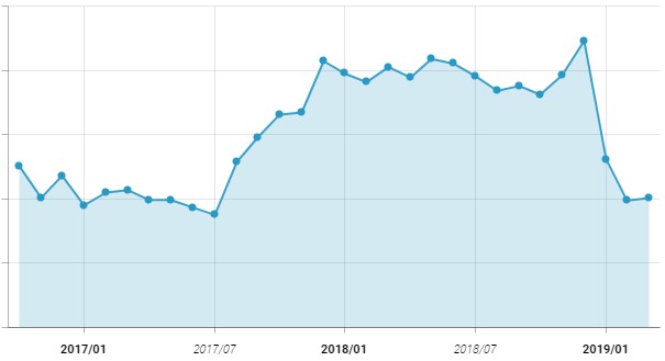 2016년 6월부터 2019년 3월까지의 '해피포인트' 앱 월간 활성 사용자 추이 그래프입니다. 지속적인 성장세를 보이다 2018년 연말 시즌 수치 상승하는 모습을 보였는요. 그 이유는 크게 2가지로 추측됩니다. 첫 번째, 크리스마스를 포함한 연말 시즌 다양한 프로모션을 통해 더 많은 유저들이 '해피포인트' 앱을 사용한 것으로 예상됩니다. 두 번째, 마일리지 포인트도 유효기간이 있는데요. 마일리지 포인트가 소멸되기 전 모두 사용하기 위해 활성 사용자 수치가 크게 증가한 것으로 보입니다.