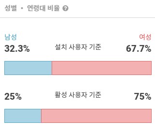 '해피포인트' 앱 설치 사용자 기준 성별 비율은 여성 67.7%, 남성 32.3%로 여성 유저들이 비율이 높게 나타났습니다. 활성 사용자 기준 성별 비율 역시, 여성75%, 남성 25%로 여성 유저들이 비율이 더 높게 기록되었습니다. 전반적으로 해피포인트 앱의 주요 유저는 여성으로 이해할 수 있을 것 같습니다.
