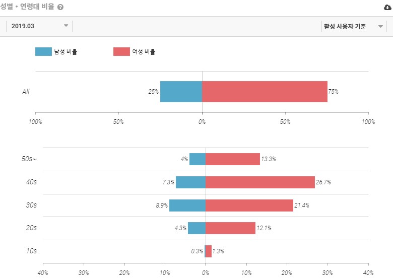 여성의 경우, 40대 26.7%로 가장 높은 수치를 기록하였으며 그 뒤를 이어 30대 21.4%, 20대 12.1%, 50대 이상 13.3% 그리고 10대 1.3%로 나타났습니다. 비율 상으로 봤을 때는 전체 유저 중 40대 여성의 비율이 가장 높은 것으로 확인되었습니다.