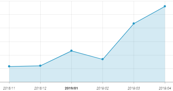 '킥고잉' 앱의 2018년 11월 부터 2019년 4월까지의 설치 사용자 수 추이 그래프입니다. 지난 연말부터 큰 기복없이 꾸준하게 상승하고 있는 모습을 보이고 있습니다. 국내에 전동 킥보드 공유 서비스가 런칭된 지 아직 1년이 안된 것을 생각하면 시장의 성장과 함께 당분간은 상승세를 유지하지 않을까 생각됩니다.