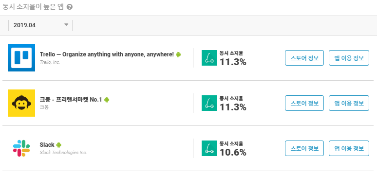 'Trello' 앱과 'Slack' 앱입니다. 이 두 앱은 팀 프로젝트를 원활하게 도와주는 서비스로 주로 직장인들과 젊은 IT 기업에서 많 많이 사용하는 서비스입니다. 그리고 동시 소지율이 높은 나머지 앱은 프리랜서 마켓 서비스인 '크몽' 입니다.