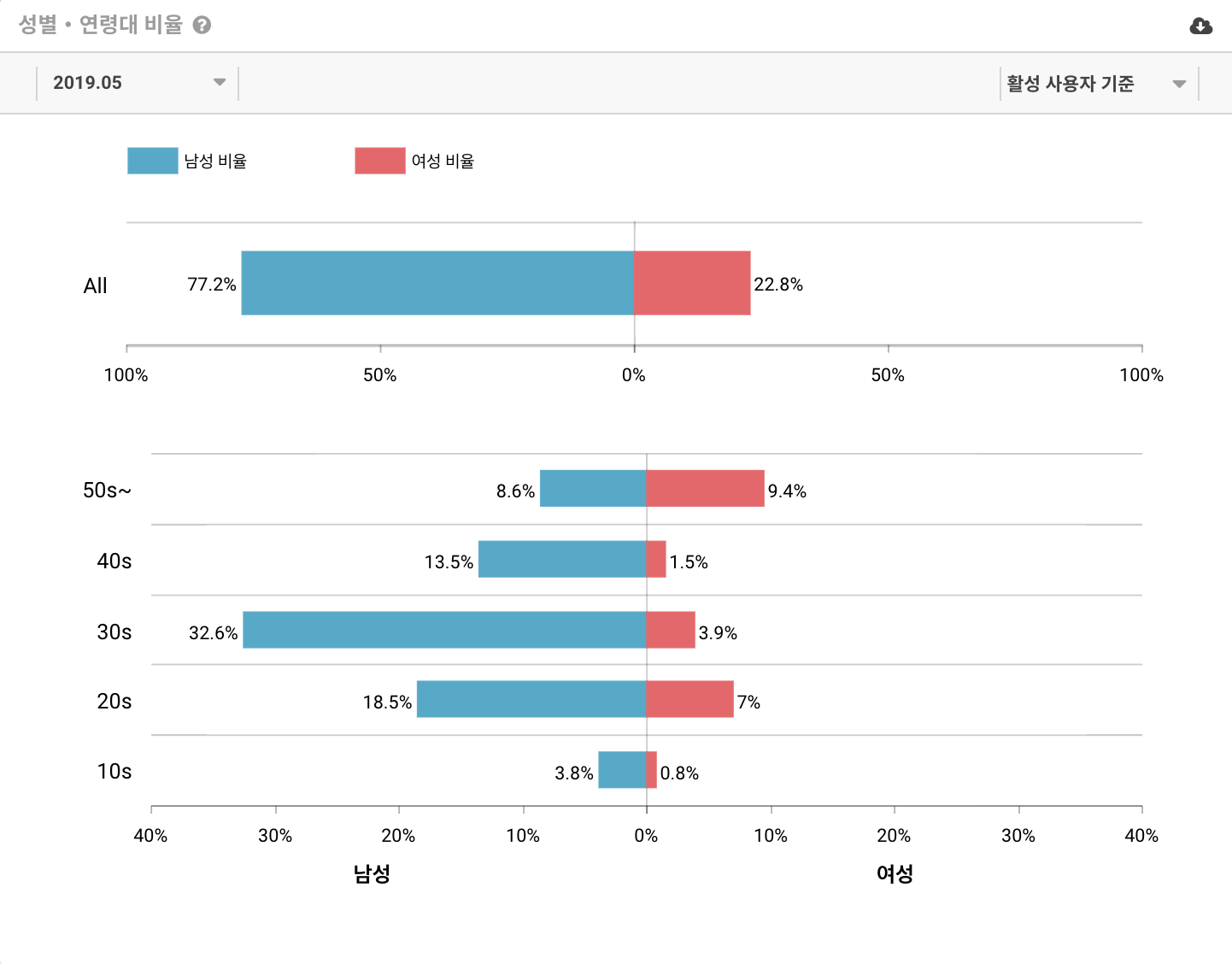 그 뒤로는 남성 20대 이상 18.5%, 남성 40대 13.5% , 남성 50대 8.6%, 10대 3.8%로 나타났습니다. 여성 유저의 비율은 50대가 9.4%로 가장 높았으며 그 뒤로 20대 7%로 비슷한 수치를 보였습니다.