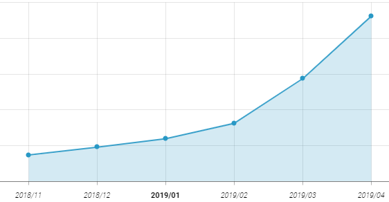 '킥고잉' 앱의 2018년 11월 부터 2019년 4월까지의 설치 사용자 수 추이 그래프입니다. 지난 연말부터 큰 기복없이 꾸준하게 상승하고 있는 모습을 보이고 있습니다. 국내에 전동 킥보드 공유 서비스가 런칭된 지 아직 1년이 안된 것을 생각하면 시장의 성장과 함께 당분간은 상승세를 유지하지 않을까 생각됩니다.