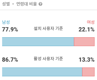 '킥고잉' 앱을 사용하는 유저들의 남녀 성비를 살펴보겠습니다. 설치 사용자 기준으로 남성이 77.9%, 여성이 22.1% 로 나타났습니다. '킥고잉' 앱의 설치 사용자는 남성이 여성이 비해 높은 설치 비율을 나타냈습니다. 활성 사용자 기준도 남성이 86.7%, 여성이 13.3%로 남성이 더 높은 사용 비율을 보였습니다.