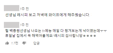 이렇게 단기간 100만명 이상의 구독자를 확보할 수 있는 이유에는 '백종원'이라는 브랜드 파워도 있겠지만, '맛있는 요리 레시피'에 대한 호기심과 욕구도 큰 몫을 차지하고 있는 것 같습니다. 실제 레시피 관련 영상들의 댓글을 보면 조리법에 대한 후기들이 주를 이루고 있습니다.