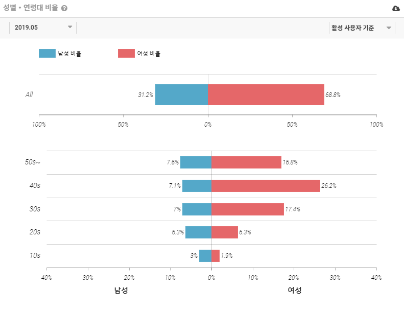 '만개의 레시피' 앱의 성별 비율을 먼저 살펴보면 여성 68.8%, 남성 31.2%로 여성의 비율이 더 많은 것으로 나타났습니다. 그 중에서도 40대 여성의 비율이 26.2%로 가장 높게 기록되었습니다.