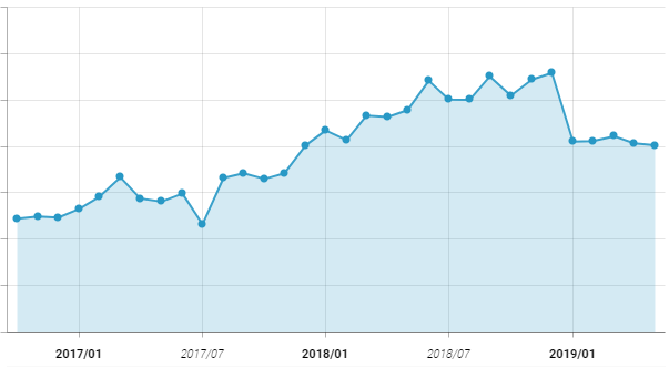 '만개의 레시피' 앱의 2016년 1월부터 2019년 5월까지의 월간 활성 사용자 수 추이 그래프입니다. 2016년 10월부터 꾸준하게 활성 사용자 추이가 증가하고 있는 모습입니다. 활성 유저의 증가세는 곧, 요리 레시피에 대한 관심도 성장하고 있다고 간접적으로 유추해볼 수 있을 것 같습니다.