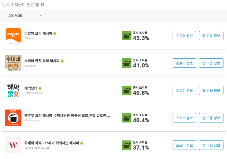 이번 포스팅에서 모바일 시장 분석 서비스인 앱에이프(App Ape)을 활용하여 실제 요리 레시피에 대한 욕구가 가장 큰 유저 층은 누구인지, 동시 소지율이 높은 앱은 무엇인지 '만개의 레시피' 앱의 데이터들을 분석해보겠습니다.