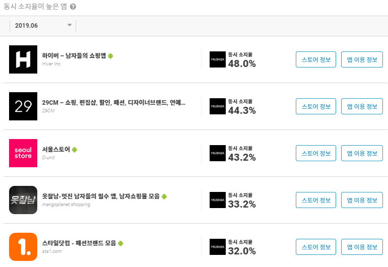한편, 동시소지 앱 상위권에 있는 남성 의류 앱들이 모두 검은색 컬러를 앱 기본 이미지로 하고 있다는 점은 재미있는 부분인 것 같습니다. 옷 잘입는 남자와 블랙 컬러는 어떤 관련이 있을까요? 남성 독자분들의 생각이 궁금하네요.