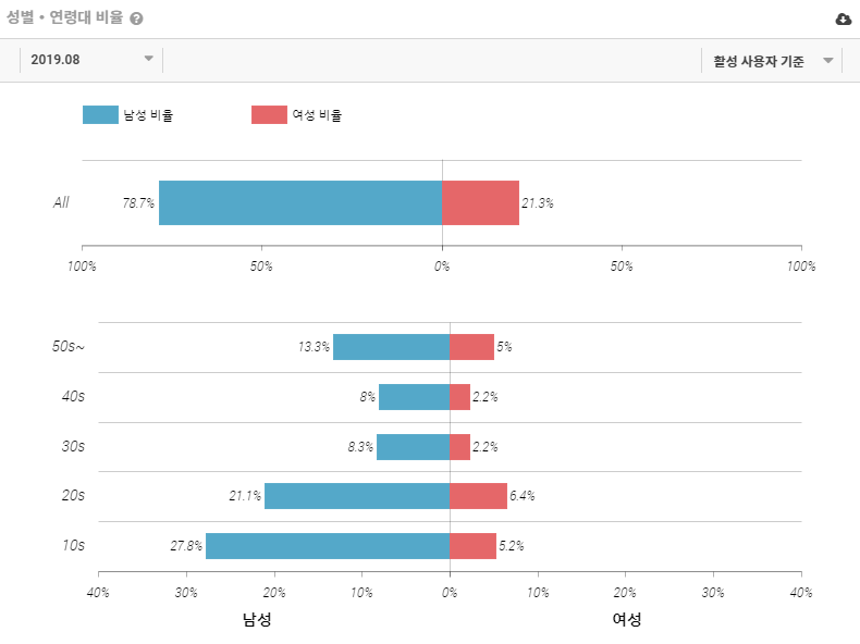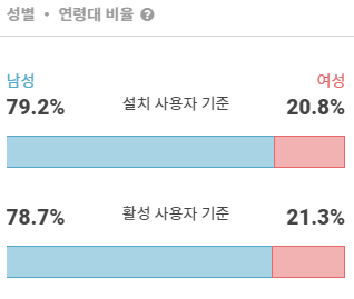 '디스코드' 앱의 성별 비율을 살펴보겠습니다. 설치 사용자 기준으로 남성 79.2%, 여성 20.8%로 남성 비율이 상당히 높은 모습을 보여주었습니다. 활성 사용자 역시 마찬가지로 남성 78.7%, 여성 21%로 남성 비율이 높습니다.