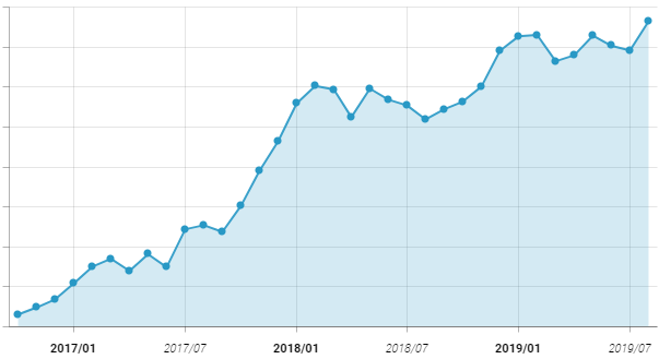 실제 월간 활성 사용자 수 추이 그래프를 살펴봐도 2016년부터 하락세 없이 성장하고 있는 모습을 보이고 있습니다. 최근 2019년 7월에는 최대 월간 활성 사용자 수치를 갱신하면서 앞으로 더 성장할 것 같으로 기대됩니다.
