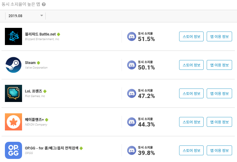 '디스코드' 앱과 동시 소지율이 높은 앱 리스트입니다. 리스트를 살펴보면 상위 5개 앱 모두 게임 관련 앱입니다. 동시 소지율 데이터를 통해서 수치적으로도 게임에 관심이 많은 성향의 사람들이 디스코드 앱을 사용하는 것을 확인할 수 있겠네요.