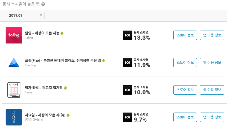 3, 4번째로 높은 동시 소지율을 기록한 앱들은 일기장 앱인 ‘백자 하루’와 시(試) 큐레이션 서비스 ‘시요일’입니다. 동시 소지율 1~2위를 차지한 앱과는 조금 다른 카테고리인데요. 일기장과 시 큐레이션 서비스를 사용하는 유저들의 동시 소지율이 높은 것을 보니 감성적인 성향의 유저들이 ‘클래스 101’ 앱을 사용한다고 볼 수 있을 거 같네요.