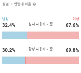 조금 더 자세하게 살펴보겠습니다. 가장 많은 비율을 차지하는 유저는 30대 여성으로 30.6% 비율을 보이고 있습니다. 그 다음으로 20대 여성 26.7%, 20대 남성 14%, 그리고 30대 남성 11.4%로 나타났습니다. 여성의 경우 30대가, 남성의 경우 20대가 가장 높은 비율로 나타났네요.