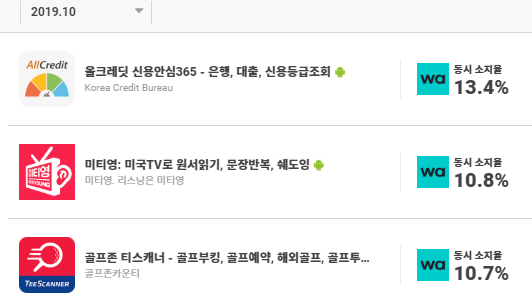그 다음으로 동시 소지율이 높은 앱은 영어 학습을 도와주는 '미티영'입니다. '미티영'은 직장인을 타겟으로 한 영어 학습 서비스입니다. 동시 소지율이 높은 앱의 타겟들을 봤을 때 확실히 직장인들이 '와디즈'를 많이 이용하고 있다고 이해할 수 있겠네요.