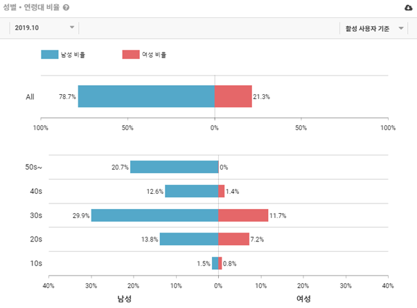 10대들의 경우, 아무래도 타 연령대와 비교해서 구매력이 약하다 보니 남성(1.5%)/여성(0.8%) 모두 낮은 비율을 보였습니다.