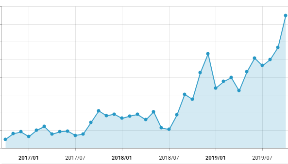 '와디즈'의 월간 활성 사용자 수 추이 그래프입니다. 그래프의 상승 곡선을 본다면 2017년부터 꾸준하게 성장하고 있는 모습을 확인할 수 있습니다. 특히 최근 2년간의 성장세가 더욱 돋보이는데요. 올해 5월에는 310억 규모의 시리즈C 투자를 유치하면서 가파른 성장 그래프를 그렸으며 지난 10월 최고 활성 사용자 수를 기록했습니다.