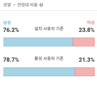 '와디즈' 유저들의 성별 비율 표입니다. 설치 사용자 기준으로 남성 76.2%, 여성 23.8%로 남성의 비율이 더욱 더 높은 모습입니다. 활성 사용자 기준 비율도 크게 차이 나지 않습니다. 남성 78.7%, 여성 21.3%로 설치 사용자 기준 수치와 유사한 수준입니다.