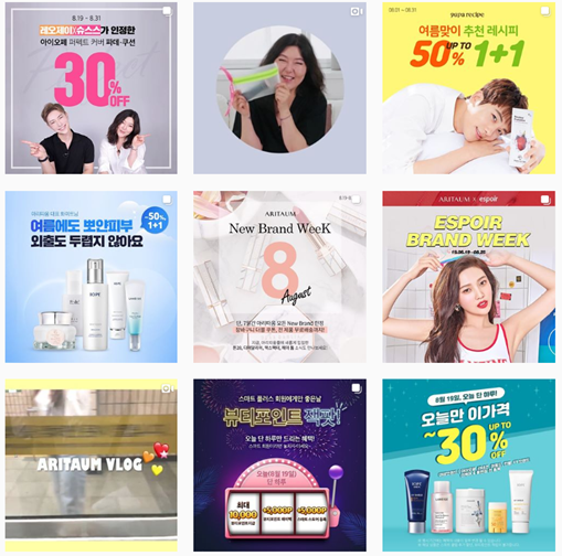 전략이 선명하니 전술의 실행도 심플해진다. 브랜드 아이덴티티가 선명하니 슬로건 역시 분명해진다. 제품명은 말할 것도 없다. 중요한 것은 이러한 청정 섬의 이미지를 어떻게 온라인 마케팅 전략의 실제로 활용할 것인가의 여부다. 이 차이는 이니스프리가 운영하는 인스타그램 채널을 보면 더욱 명확해진다. 이니스프리의 과거 운영 전략은 한 마디로 판매를 위한 세일 전략이었다. 그 안에서 '이니스프리'만의 아이덴티티를 찾아보기는 어려웠다. 여타 유사한 브랜드의 인스타그램 채널과의 구별도 힘들었다. 목적(전략)이 비슷하니 그 방법(전술) 역시 비슷할 수밖에 없다. 하지만 이니스프리는 이후 인스타그램의 운영 전략을 완전히 바꾸게 된다. 청정 섬 제주의 톤앤매너를 그대로 살린 콘텐츠들로 전혀 새로운 시도를 과감히 시작한 것이다. 새로운 이니스프리 인스타그램 계정의 주인공은 다름 아닌 제주의 자연, 그 자체이다. 모델과 제품은 주인공의 품에 안긴 조연의 역할을 한다.