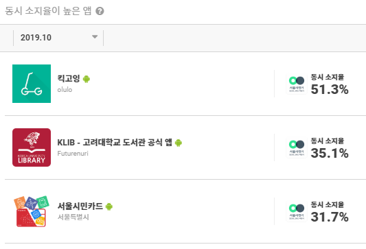 <'따릉이' 앱과 동시 소지율이 높은 앱 (2019년 10월) / 출처 : App Ape>