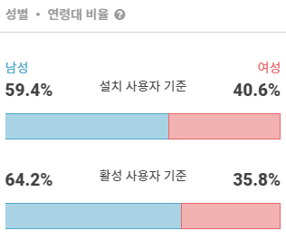 '따릉이' 앱의 성별 그래프입니다. 설치 사용자 기준으로 남성 59.4%, 여성 40.6% 수치가 기록되었습니다. 활성 사용자 기준으로는 남성 64.2%, 여성 35.8%로 나타나며 설치 사용자, 활성 사용자 모두 남성의 비율이 높은 것으로 확인할 수 있습니다.