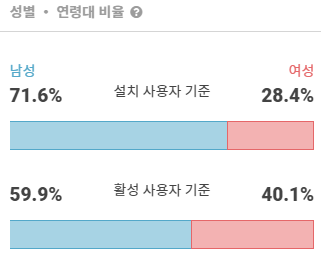 '원티드' 앱의 성별 비율 그래프입니다. 설치 사용자 기준으로 남성이 71.6%, 여성이 28.4%로 남성의 비율이 매우 높은 것으로 확인되었습니다. 활성 사용자 비율 역시 남성이 59.9%, 여성이 40.1%로 남성이 높은 것으로 나타났습니다. 실제 '원티드' 앱을 사용하는 여성 유저의 비율이 설치 유저보다 높은 수치를 보여주었으나 전반적으로 설치 및 실사용 유저들은 남성들이 더 많은 것으로 볼 수 있겠네요.