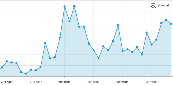 '원티드' 앱의 월간 활성 사용자 수 추이 그래프입니다. 전체적인 그래프의 움직임을 살펴보면 연말 시즌에 그래프 곡선이 높아지는 것을 확인할 수 있습니다. 2017년을 살펴보시면 하반기부터 크게 그래프가 성장하다가 2018년 상반기에 점차 줄었다는 것을 확인할 수 있습니다. 2018년, 2019년도 마찬가지로 7월 이후 하반기부터 그래프가 성장하는 모습을 보여주었습니다. 그래프를 통해 추측해본다면 원티드 이용자들은 하반기부터 이직에 대한 고민을 시작한다고 볼 수 있지 않을까요?