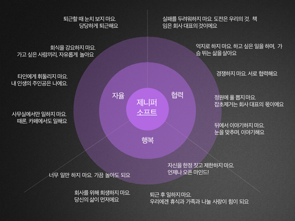 제니퍼소프트라는 회사의 핵심 컨셉은 자율과 협력, 행복이다. 이들은 이런 명확한 컨셉을 가지고 회사의 Do's & Don'ts를 상세하게 규정하고 있다. 이 회사의 대표는 공중파 TV의 프로그램에 출연해 이렇게 말한 바 있다. 왜 직원들이 놀면 안되냐고. 그래서 회사 지하에 풀장을 만들었다. 자신이 맡은 업무만 완수할 수 있다면 오후 3, 4시에 출근해도 무방하다. 자신의 자리도 따로 없다. 여기서 이 회사의 컨셉은 세 개의 키워드로 분할할 수 있다. 이후 회사의 모든 활동은 이러한 키워드가 만들어낸 기준에 따라 운영되기만 하는 것이다. 만일 이 키워드에 맞지 않는 규정이 생긴다면 직원 중 누군가가 이의를 제기할 것이다. 회사의 가치에 맞는 선택이냐고 말이다.