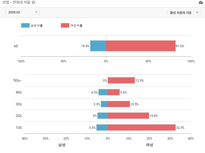 아무래도 아이돌의 스케줄까지 관심을 가지며 진심으로 아이돌에게 애착을 가지는 팬덤 성향은 여성 비율이 높은 것 같습니다. 조금 더 자세하게 연령별 그래프도 살펴보겠습니다.