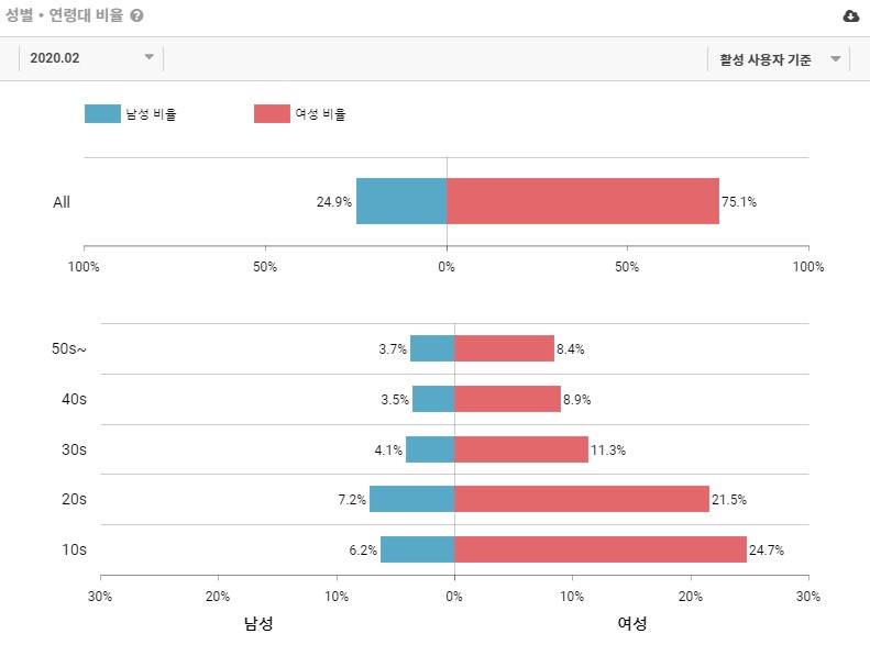 일부 앱 중에서는 설치 사용자 수와 활성 사용자 수의 차이가 많은 경우도 있는데요. 'V LIVE' 앱은 설치 사용자 수와 활성 사용자 수의 수치 차이가 크게 나지 않는 것이 인상적입니다.