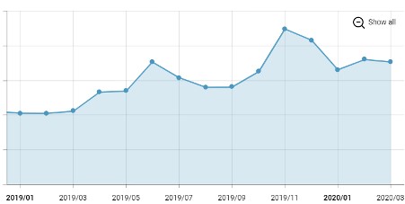 'SK엔카' 앱 여성 월간 설치 사용자 수 추이(19.01~20.03) / 안드로이드+iOS 합산, 출처: App Ape