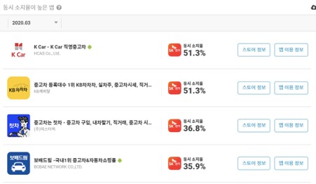 재미있게도 'SK엔카' 앱의 동시소지율 상위 4개 앱 모두 중고차 플랫폼 서비스입니다. 'SK엔카' 앱 사용자들의 성향은 중고차에 높은 관심을 가지고 있다고 볼 수 있겠네요.