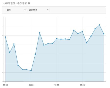 'SK엔카' 앱 시간대별 활성 사용자 수(20.03) / 안드로이드+iOS 합산, 출처: App Ape